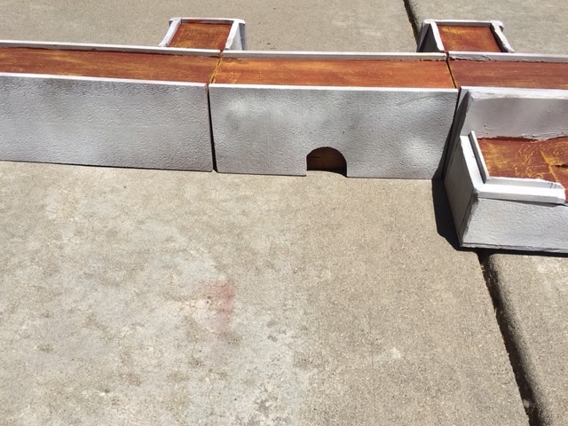 Dramatic change in direction from yesterday's post and pictures below. Decided I wanted to go with a whiter range for the walls - for multiple game use reasons. So I gathered some spray paint and went to work and sprayed everything. Then laid it all out and decided it was too white and added the colored wall tops and ramps - the walkways. Above is a long shot of the 12' of wall (actually 143" give or take - lost some length in sanding out some end mismatches but it will be enough length.