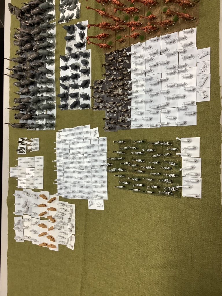 Note that I'm posting near the top of the thread rather than the bottom. A large number of animals below are now painted and based and ready to game - though many more still need to be painted though almost all are primed and ready. And I'm hoping, hoping, hoping for some more appropriate gazelle types for Africa and maybe a few primate types, too. We shall see, at least have a manufacturer that seems willing to some degree.